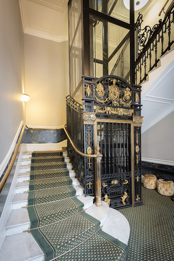 The car was panoramic with no corner frames and with a special finish in order to fit in to the historic staircase and landing doors.